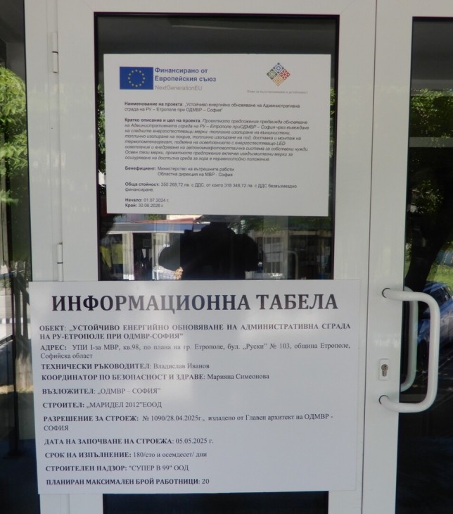 На 15 май в сградата на РУ-Етрополе се състоя официална церемония по откриване на строителна площадка, с което стартира реализацията на проект: „Енергийно обновяване чрез прилагане на мерки за енергийна ефективност на административна сграда на РУ на МВР, гр.Етрополе“.