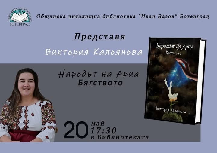 От 17:30 часа днес – 20 май /сряда/, в Общинска читалищна библиотека “Иван Вазов“ – Ботевград, ще бъде представена книгата “Народът на Ариа. Бягството“ с автор Виктория Калоянова.