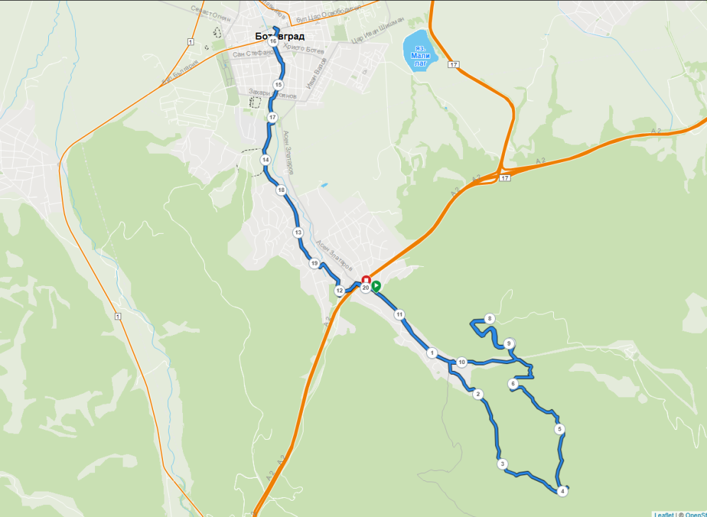 Бул. „Трети март“, ул. „Жабешко блато“, ул. „Леската“, ул. „Междуречна“, ул. „Асен Златаров“ (в участъка зад бензиностанция „Лукойл“, от моста на автомагистрала „Хемус“) и пътя от автобусното обръщало – разклона за „Чановете“ до чешмата при „Стубеля“ – от 10:00 ч. до 13:30 ч., или до преминаването на всички участници на средната (8 км) и дългата дистанция (21 км).