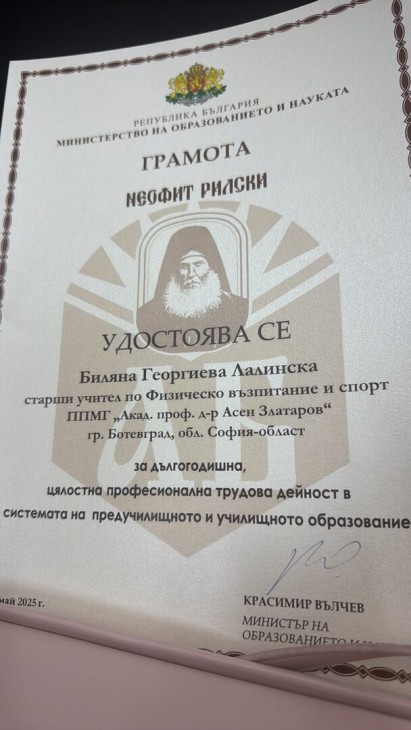 Призът „Неофит Рилски“, най-престижното отличие за принос в образованието, бе връчен на г-жа Биляна Лалинска – дългогодишен и обичан преподавател, вдъхновил поколения ученици.