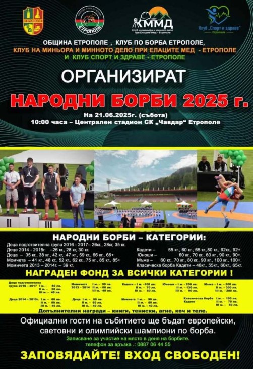 Община Етрополе, Клуб на миньора и минното дело при Елаците-МЕД, Клуб Спорт и здраве – Етрополе и Клуб по борба- Етрополе организират на 21 юни 2025 г. на стадиона Народни борби