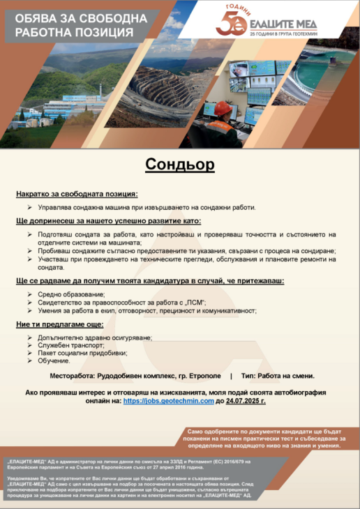 >Управлява сондажна машина при извършването на сондажни работи. Ще допринесеш за нашето успешно развитие като: