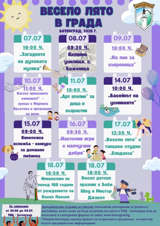 За поредно лято Община Ботевград ще зарадва най-малките жители с поредица от занимания под мотото „Весело лято в града“, насочени към деца над 5-годишна възраст.