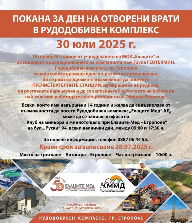 По повод 50 години от учредяването на МОК „Елаците“ и 25 години от присъединяването на компанията към Група ГЕОТЕХМИН, Рудодобивен комплекс, гр. Етрополе отваря своите врати за едно по-различно преживяване. За първи път ще имате възможност да посетите ПРЕЧИСТВАТЕЛНИТЕ СТАНЦИИ, намиращи се на рудника, да разгледате парк-музея и да се запознаете с естеството на работа на най-големия работодател на територията на Община Етрополе.