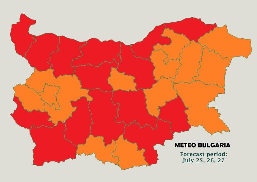 Из областите с оранжево максималните температури ще са 38°-41°С, а малко по-ниски, но продължителни и изтощителни за организма ще са по крайбрежието и в Смолянско!