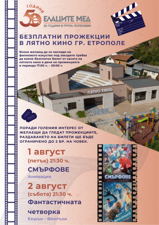 Очаква ви магията на киното под звездите – с любими филми, удобни седалки и приятна лятна атмосфера в сърцето на Етрополе!