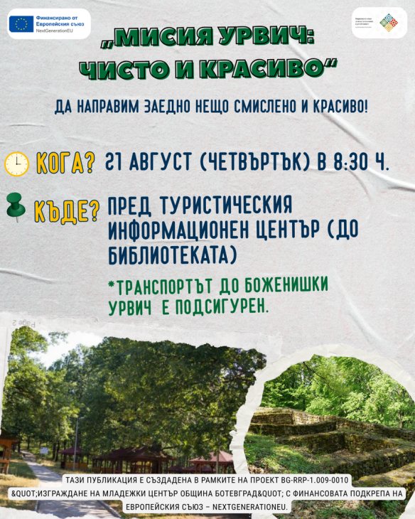 На 21 август младежи от 13 до 29 години ще имат възможност да се включат в инициативата „Мисия Урвич: Чисто и красиво“ и да оставят своя положителен отпечатък.