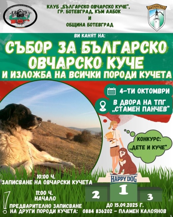 Клуб за българско овчарско куче – Ботевград, към Асоциация за аборигенно българско овчарско куче, със съдействието на Община Ботевград, организира Събор за българско овчарско куче и изложба на всички породи кучета. Събитието ще се състои на 4 октомври в двора на ТПГ „Стамен Панчев“, в Ботевград. Oфициалното откриване е предвидено за 11:00 ч.