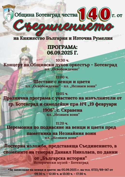 Записване за венци и цветя ще се извършва на 05.09.2025 г. на тел. 0723/69-147 от 08:30 ч. до 12:30 ч. и от 13:30 ч. до 17:30 ч., или на място в Туристически информационен център – Ботевград.