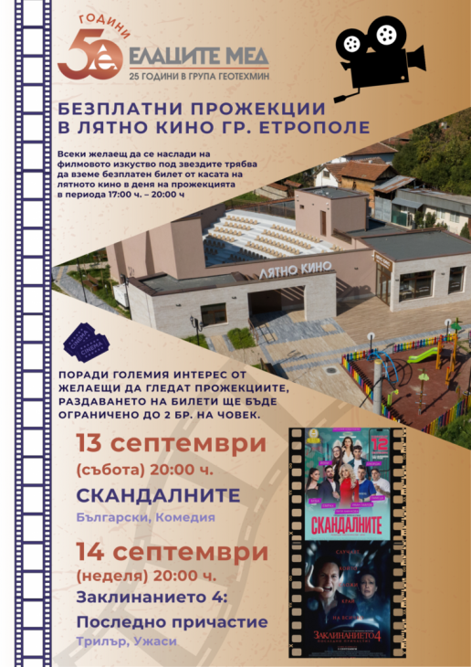 Събитията са част от поредицата културни прояви, организирани по повод 50-годишния юбилей на „Елаците-Мед“, които превръщат летните вечери в Етрополе в истински празник за цялото семейство.