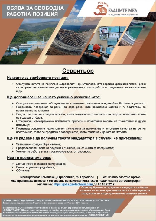 Месторабота: Комплекс „Етрополия“, гр. Етрополе | Тип: Пълно работно време.