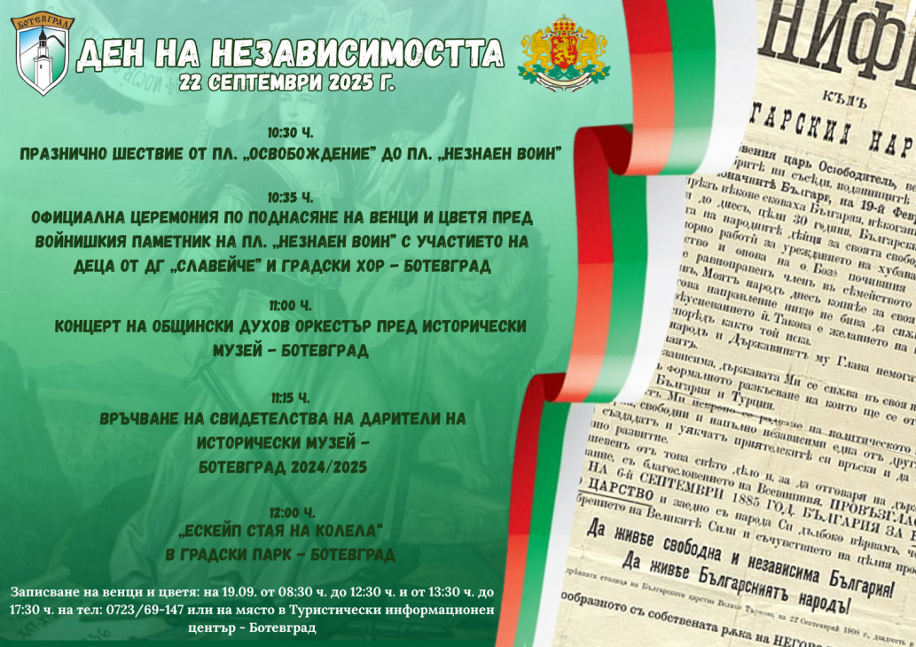 На 22 септември 2025 г. /понеделник/ Община Ботевград ще отбележи 117-ата годишнина от обявяването на Независимостта на България – важна историческа дата, която има специално място в сърцата на всички българи.