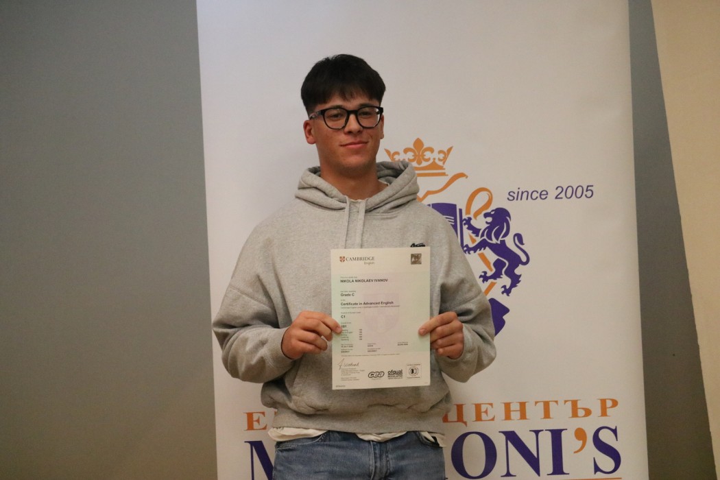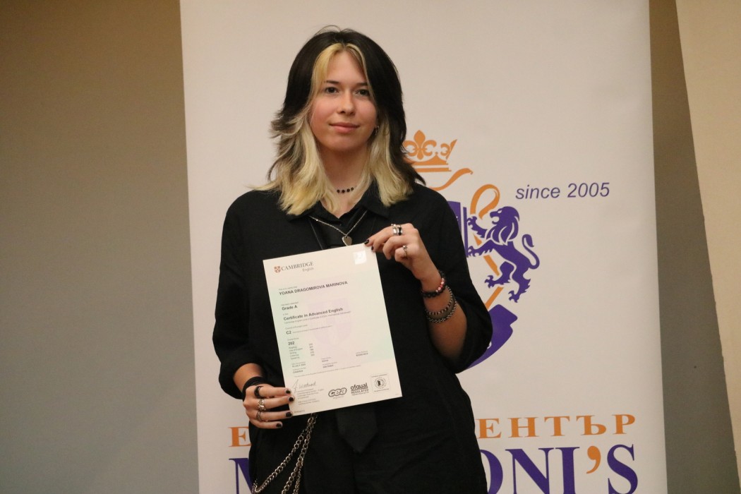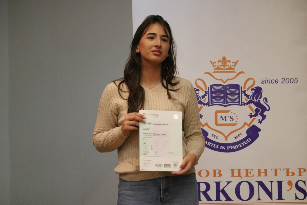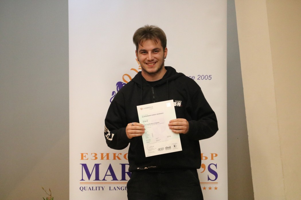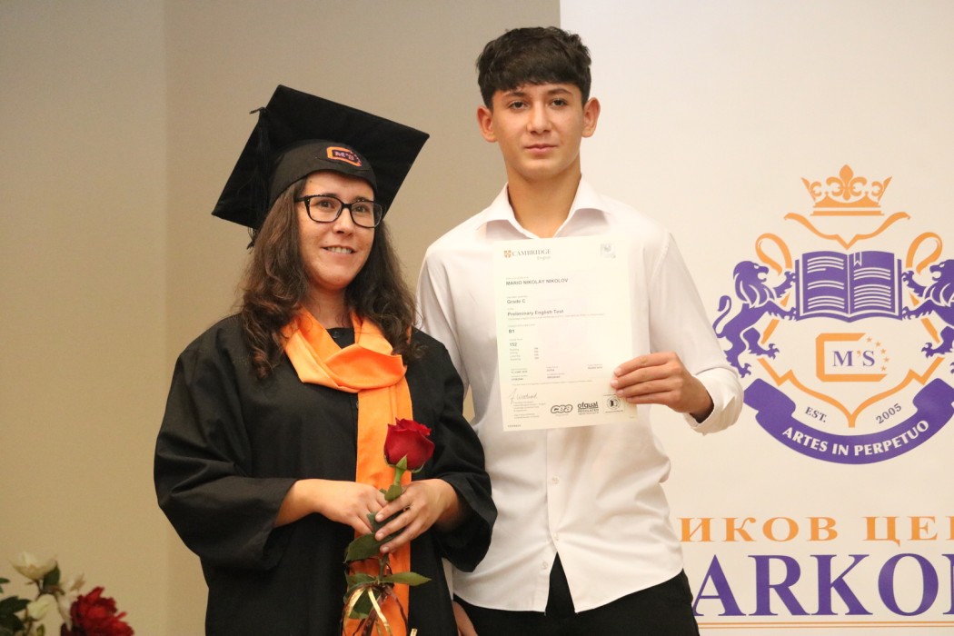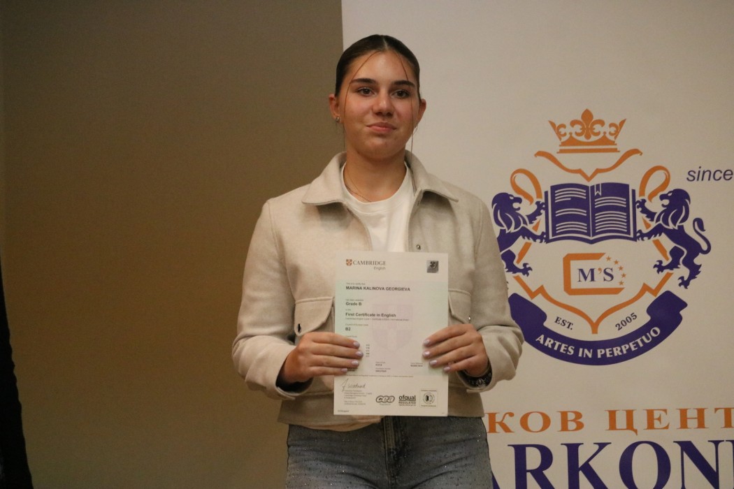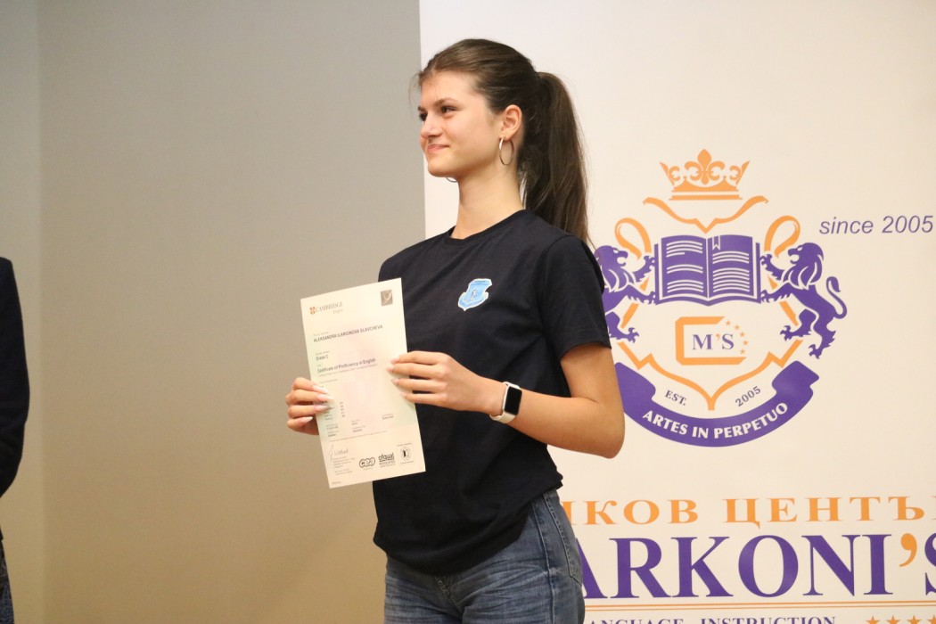 Тази година сертификати получиха 86 ученици, положили успешно изпитите по английски език. От тях 48 са с най-високата възможна оценка, което представлява 55,8% от всички кандидати – поредно доказателство за високото ниво на подготовка в „Марконис“.
