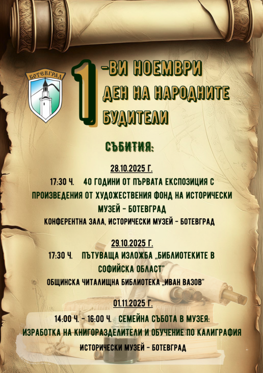 В навечерието на 1 ноември – Деня на народните будители, Община Ботевград Исторически музей – Ботевград и Общинска читалищна библиотека организират поредица от културни събития, посветени на българските просветители и будители, оставили ярка следа в историята и културата на България.