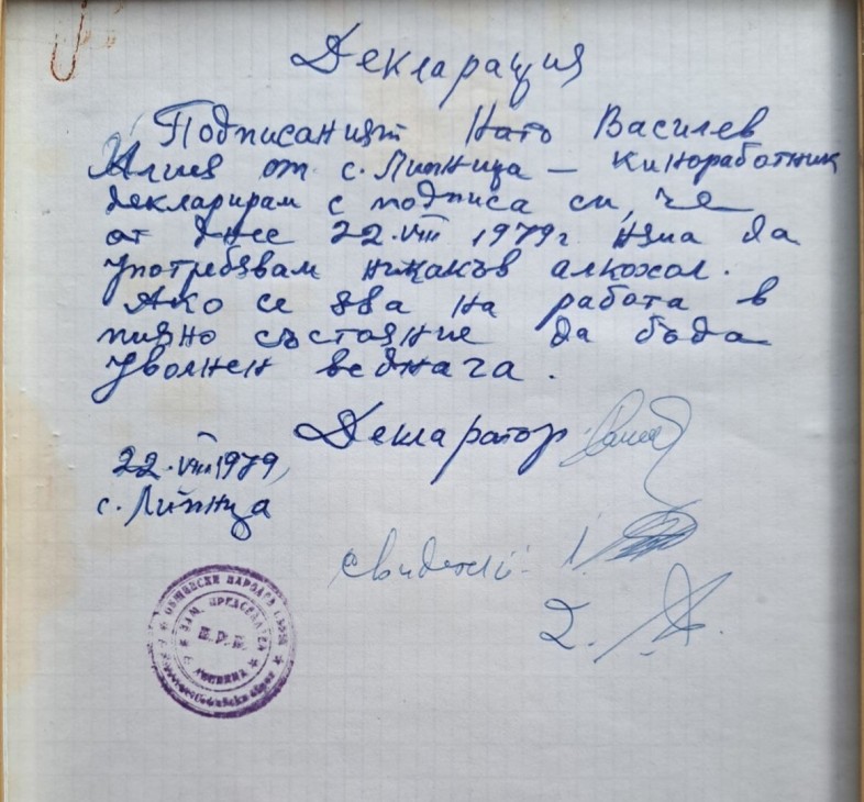 Един от най-екстравагантните материали в изложбата по повод събора на Липница, е ръкописна декларация от Нато Василев Алиев – киноработник в кино “Слънце“ в селото. Нато декларира, че от 22 август 1979 година няма да употребява никакъв алкохол. Ако се яви на работа пиян – да бъде уволнен веднага. Той е положил подписа си, а под него са се подписали и двама свидетели. Документът е подпечатан с печат, на който пише Общински народен съвет.