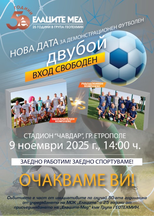 Като част от инициативите по случай 50 години от учредяването на МОК „Елаците“ и 25 години от присъединяването на Елаците-Мед към Група ГЕОТЕХМИН, ръководството на компанията организира демонстрационен футболен двубой между представителни отбори на Елаците-Мед от Рудодобивен и Обогатителен комплекс.