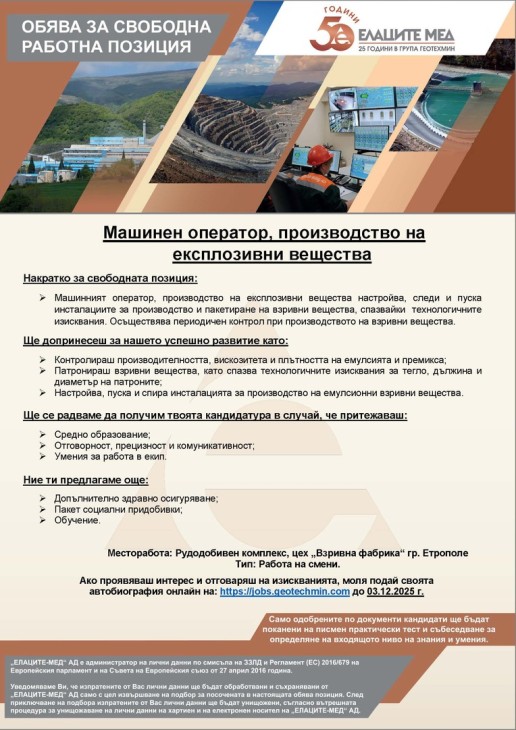 Ако проявяваш интерес и отговаряш на изискванията, моля подай своята автобиография онлайн на: https://jobs.geotechmin.com до 03.11.2025 г.