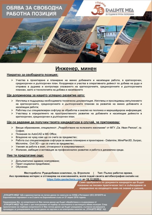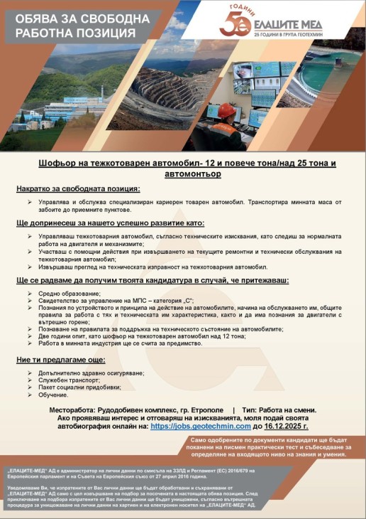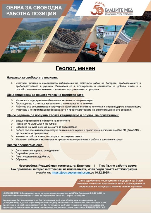 Ако проявяваш интерес и отговаряш на изискванията, моля подай своята автобиография онлайн на: https://jobs.geotechmin.com до 16.12.2025 г.