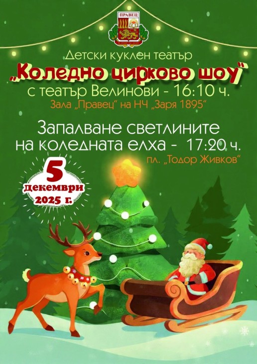 Преди запалване на коледните светлини, всички малчугани са поканени да се насладят на Детския куклен театър, който ще представи „Коледно цирково шоу“. Събитието ще се проведе в зала „Правец“ на НЧ „Заря 1895“ и е идеалната възможност за децата да се забавляват, да танцуват с приказните герои и да се потопят в магията на коледната атмосфера.