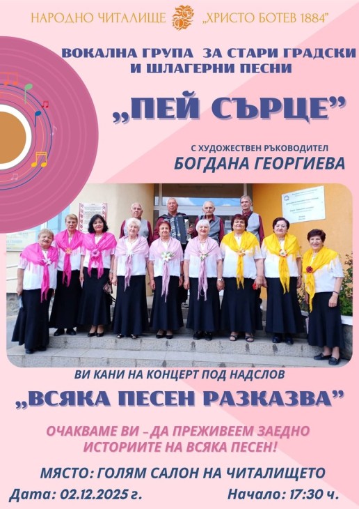 Вокална група “Пей сърце“ при Народно читалище „Христо Ботев 1884“ в Ботевград ви кани на вълнуващ концерт с наслов „Всяка песен разказва“. Събитието ще се проведе днес от 17:30 часа в големия салон на читалището. Заповядайте да преживеем заедно историите, които всяка песен носи, в атмосфера на настроение, спомени и красиви мелодии!