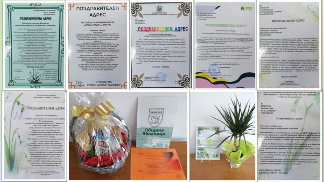 “С дълбока признателност и гордост честваме 20 години, откакто ДГ „Кокиче“ отвори своите врати, за да дарява децата с топлина, грижа и увереност в първите им крачки към света“. През тези две десетилетия нашата градина се превърна в символ на обич, отдаденост и вдъхновение“, каза в словото си директорът на детската градина – Милена Маринов. Тя изрази благодарност и признателност към всички, които през годините са били и продължават да бъдат част от голямото семейство на ДГ “Кокиче“ - педагози, служители, родители, партньори и приятели.