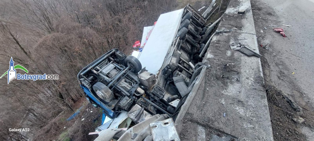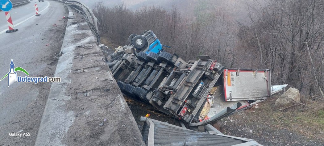 Инцидентът е станал към 9:30 часа тази сутрин. Камионът е със софийска регистрация, превозвал е хранителни стоки. Предстои оглед на мястото на инциндента и изясняване на причините, довели до него.