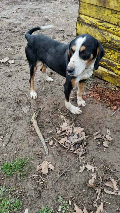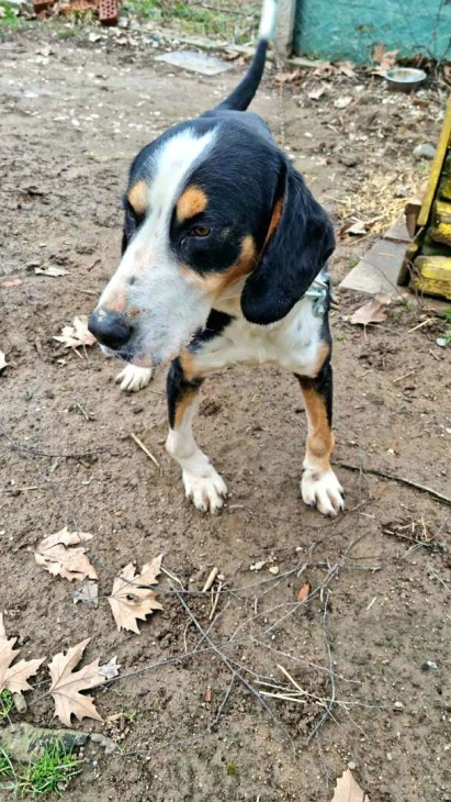 Това малко същество няма чип, на около 2 годинки е, трицветно гонче, с изменения в костите на предните лапи, причинени от липса на грижи – именно това е причината за неговото изоставяне. Въпреки всичко, то остава кротко и доверчиво. Още вярва на хората, нищо че е опозналo жестокостта на безжалостното изоставяне.