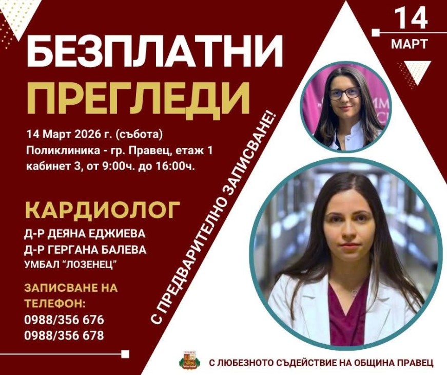 Прегледите ще се проведат на 14 март (събота) в поликлиниката, 1-ви етаж, кабинет 3, от 09:00 до 16:00 ч. (с предварително записване).