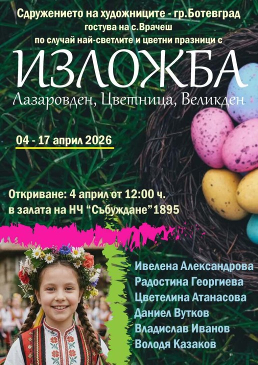 По повод светлите и цветни великденски празници Сдружение на художниците – Ботевград ще подреди изложба във Врачеш. Тя ще бъде открита на 4 април /събота/ от 12 часа в залата на Народно читалище “Събуждане 1895“. В изложбата със свои творби ще участват Ивелена Александрова, Радостина Георгиева, Цветелина Атанасова, Даниел Вутков, Владислав Иванов и Володя Казаков.