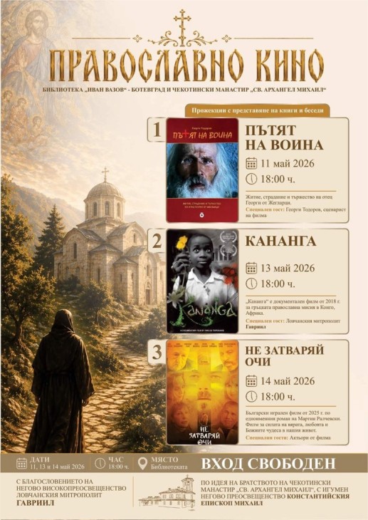 На 11, 13 и 14 май от 18:00 часа Общинска читалищна библиотека „Иван Вазов“ в Ботевград ще бъде домакин на инициативата „Православно кино“, осъществявана с благословението на Негово Високопреосвещенство Ловчанския митрополит Гавриил, по идея на Братството на Чекотинския манастир „Св. Архангел Михаил“ с игумен Негово Превъзходителство Константийския епископ Михаил.